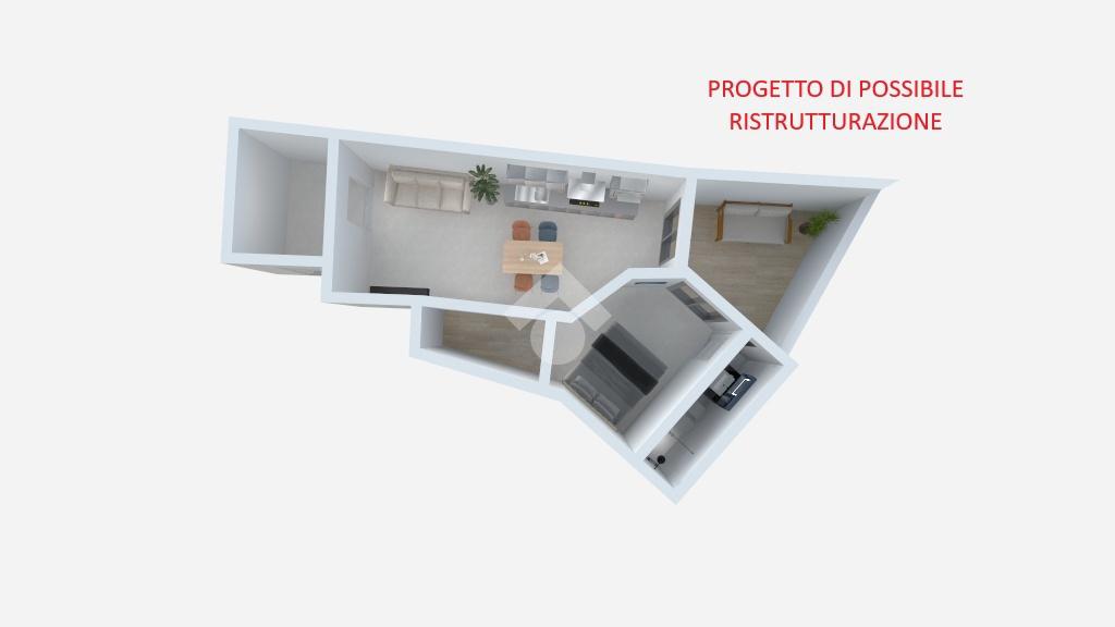 L'immobile attualmente è un open space, ma offre la possibilità di una razionale ridistribuzione interna, con progetto di divisione in: ingresso, soggiorno con angolo cottura, camera da letto matrimoniale con cabina armadio, bagno e terrazzino abitabile a livello.